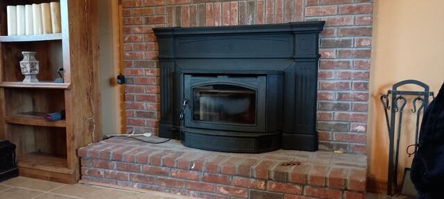 A wood insert pairs with the brick masonry to give this fireplace a timeless look.